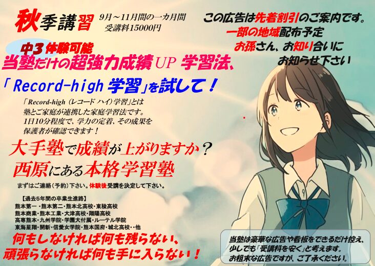 また、熊本県公立高校の入試制度も、平成12年度から少子化に伴う公立高等学校の統廃合や学科コースの編成によるスリム化、平成17年度入試からのAB評定、公立高校での前期入試と後期入試の実施、平成24年度から、普通科コースを除く特色選抜と、後期入試へのシフトチェンジ、また、学区制の緩和が進み、都市化に住む受験生にとっては、必然的にこれからも厳しい入試が継続すると予想されます。